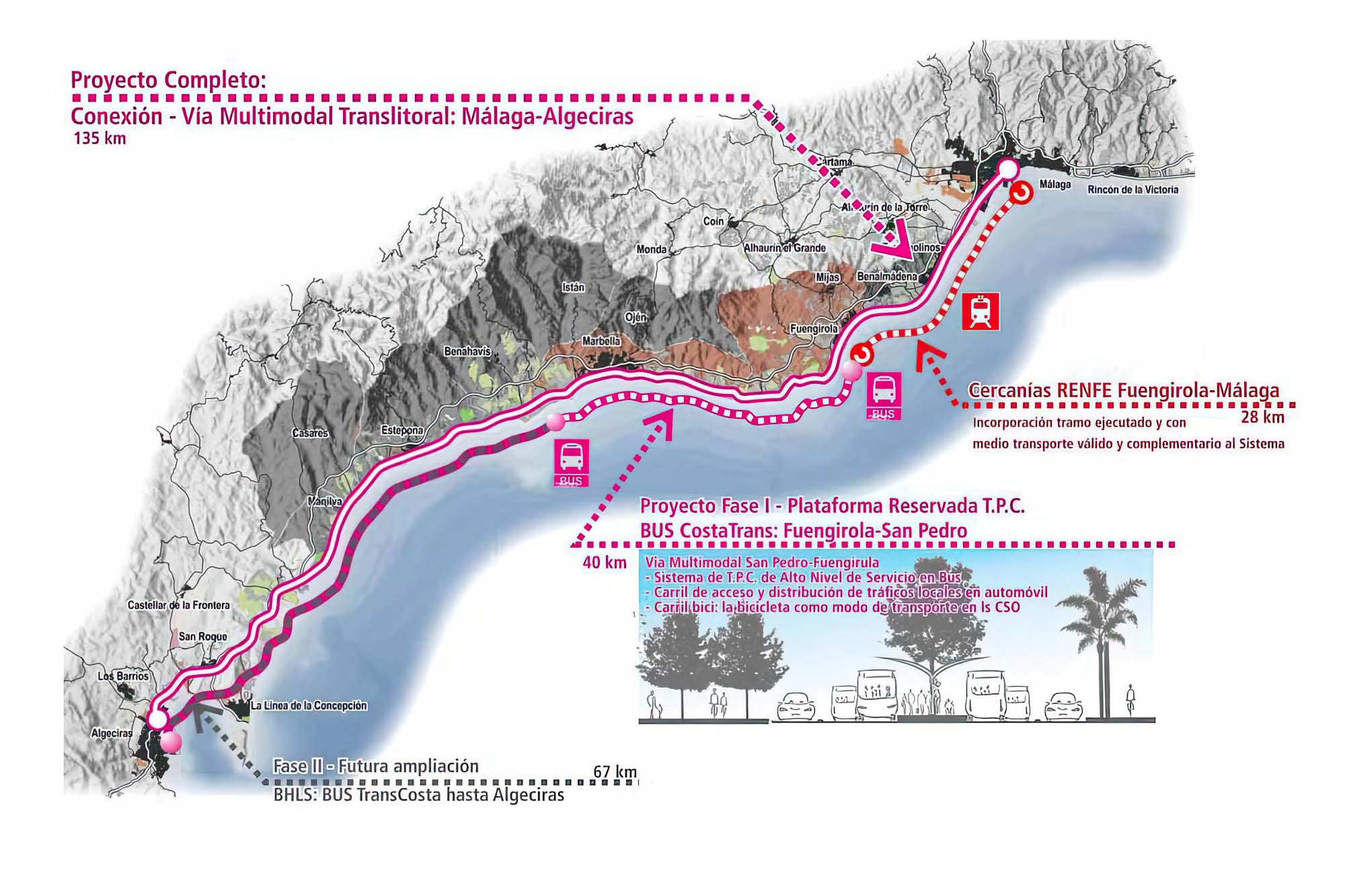 Aunque lo que está en el imaginario colectivo es el soterramiento, a poco que se estudie el tema, soterramiento, cercanías y media distancia (Málaga-Estepona o Nerja-Algeciras), en esta conurbación que es la Costa del Sol, no parecen compatibles. Por eso agrada el gráfico que acompaña al texto, que propone una plataforma en superficie reservada para transporte público, BUS CostaTrans, que necesariamente tendría que ser para desplazamientos de cercanías, porque hacer muchas paradas es incompatible con emplear poco tiempo en desplazamientos de media distancia (Estepona-Málaga o Algeciras-Nerja), donde el coche gana.